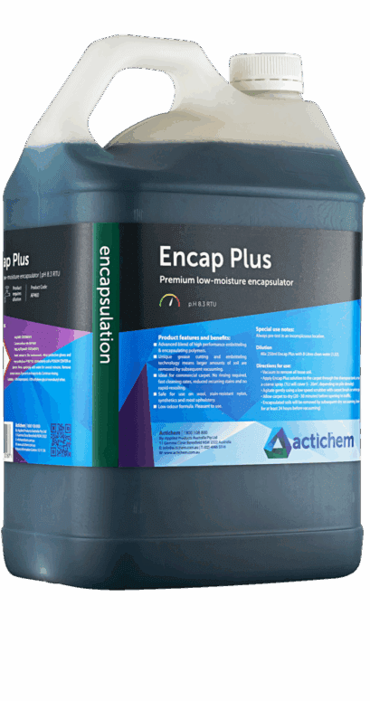 Encap Plus softens oily residues, lifts bonded petroleum films, and encapsulates the loosened soil for removal during post-vacuuming. Its controlled alkalinity supports safe cleaning on wool while its low-residue polymer system helps keep the carpet cleaner for longer.