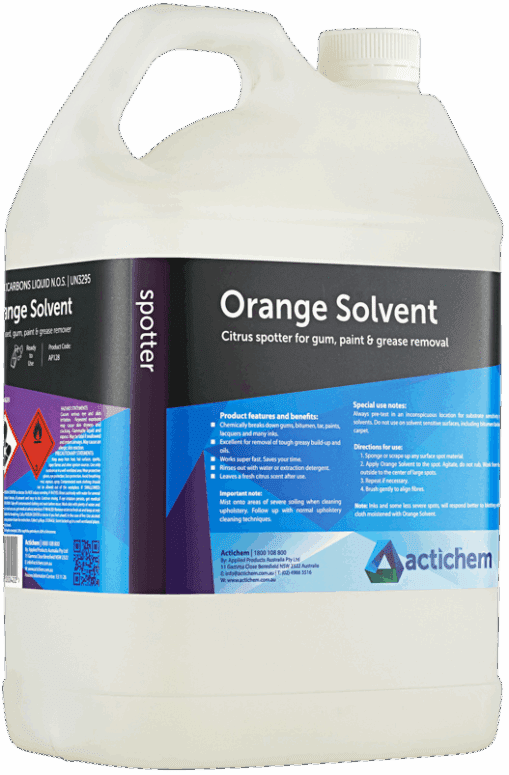 If Orange Solvent is unavailable, you can substitute it with Gum Gone – a powerful aromatic solvent for oil spot removal, or Actichem PIG – a water-rinseable, powerful stain remover that quickly breaks down tough stains such as inks, graffiti and shoe polish.