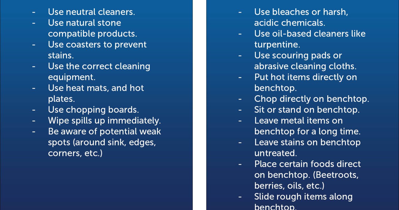 Natural stone is a delicate substrate that can easily be damaged. Due to its porous nature, it is very susceptible to staining and discoloration from everyday activities. By following the Dos and Don’ts, your natural stone will be preserved and maintain its optimum condition for many years.