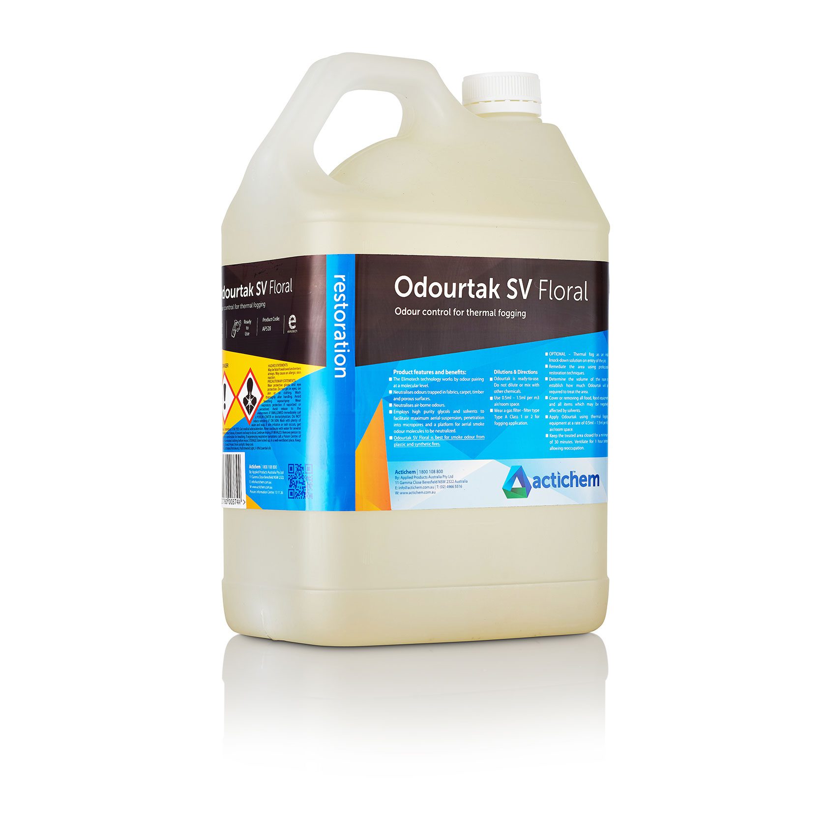 Odourtak SV – Floral is a solvent-based odour neutraliser formulated for thermal fogging in non-inhabited spaces. Powered by advanced Elimotech chemistry, it targets and eliminates stubborn smoke and soot odours caused by plastic and synthetic fires. Its potent formula penetrates deep into porous surfaces and concealed spaces, delivering comprehensive odour elimination during fire restoration in sub-floors, attics, and stripped-out buildings.